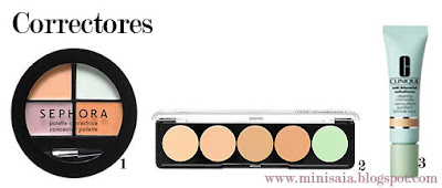 1. Palete de correctores Sephora. 2. Palete de correctores Make Up For Ever. 3. Anti-bleamish solutions clearing concealer da Clinique.