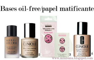1.Base oil-free Bobbi Brown. 2. Base Stay-true makeup oil-free da Clinique. 3. Papel matificante da Sephora. 4. Base Superfit makeup oil-free da Clinique.